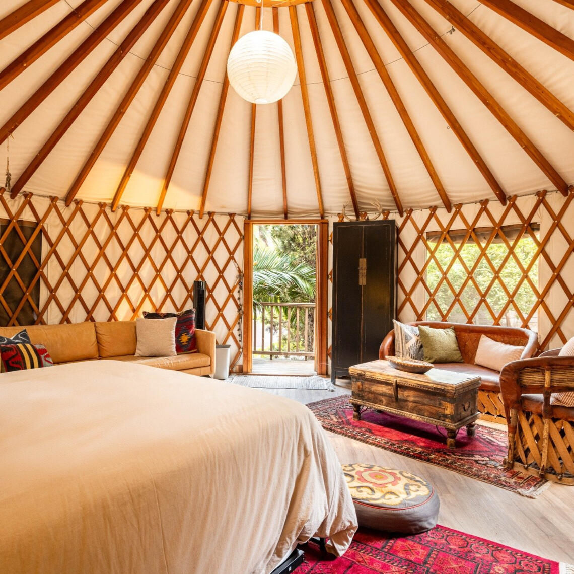 Tucked away in the hills of Silver Lake, this secluded yurt offers tranquility and privacy just a 5-minute walk to the shopping, dining, and nightlife of Sunset Boulevard. A winding path leads to a hilltop retreat featuring a bohemian, luxurious bathroom, outdoor dining, multiple lounge areas, and a private deck with peekaboo views of the Hollywood Sign through palm fronds. The lush, light-filled bathroom offers a soaring skylight and vibrant natural plant life, bringing the outdoors in. With mature trees, a coffee station, and an abundance of natural light, this bohemian oasis is a unique blend of nature beauty and urban charm—ideal for unwinding, recharging, or finding creative inspiration.